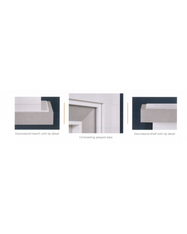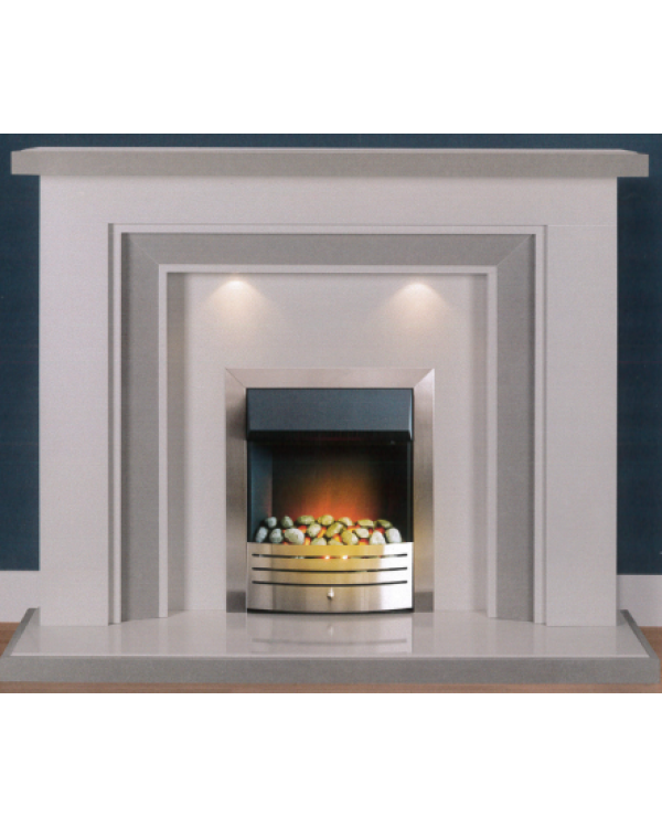 The Copenhagen 54" Wide Fireplace is finished in Soft White Mirco Grained Marble with Vienna Grey Detailing.